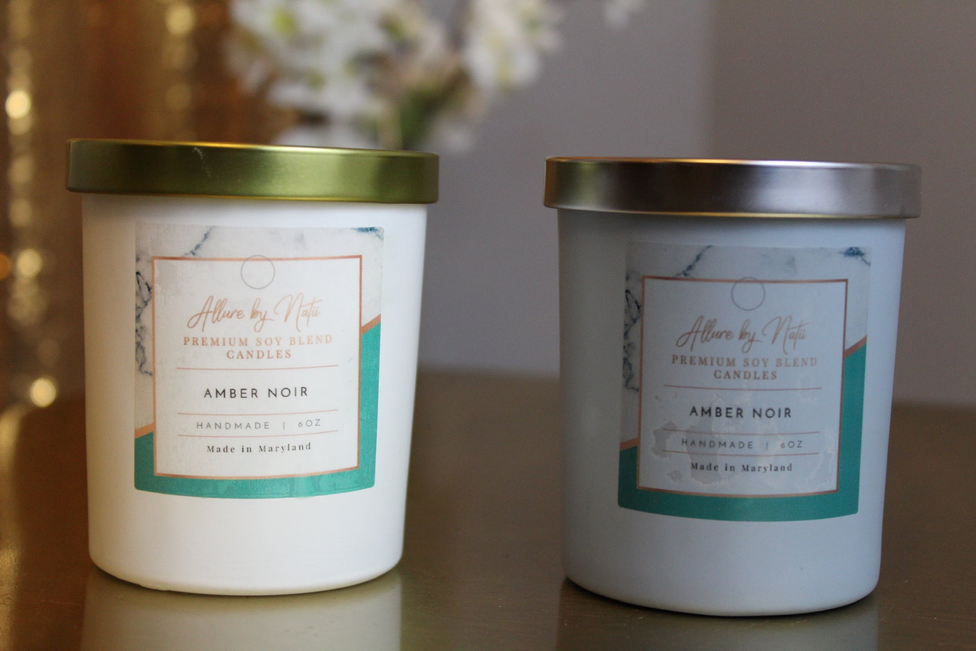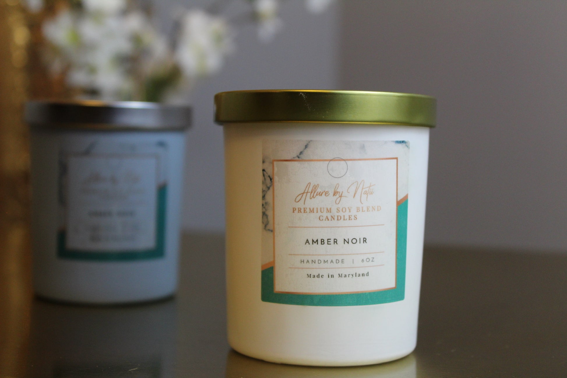 9oz Amber Noir Premium Soy-blend Candle. Comprised of a vegan wooden wick that crackles for the ultimate relaxation.