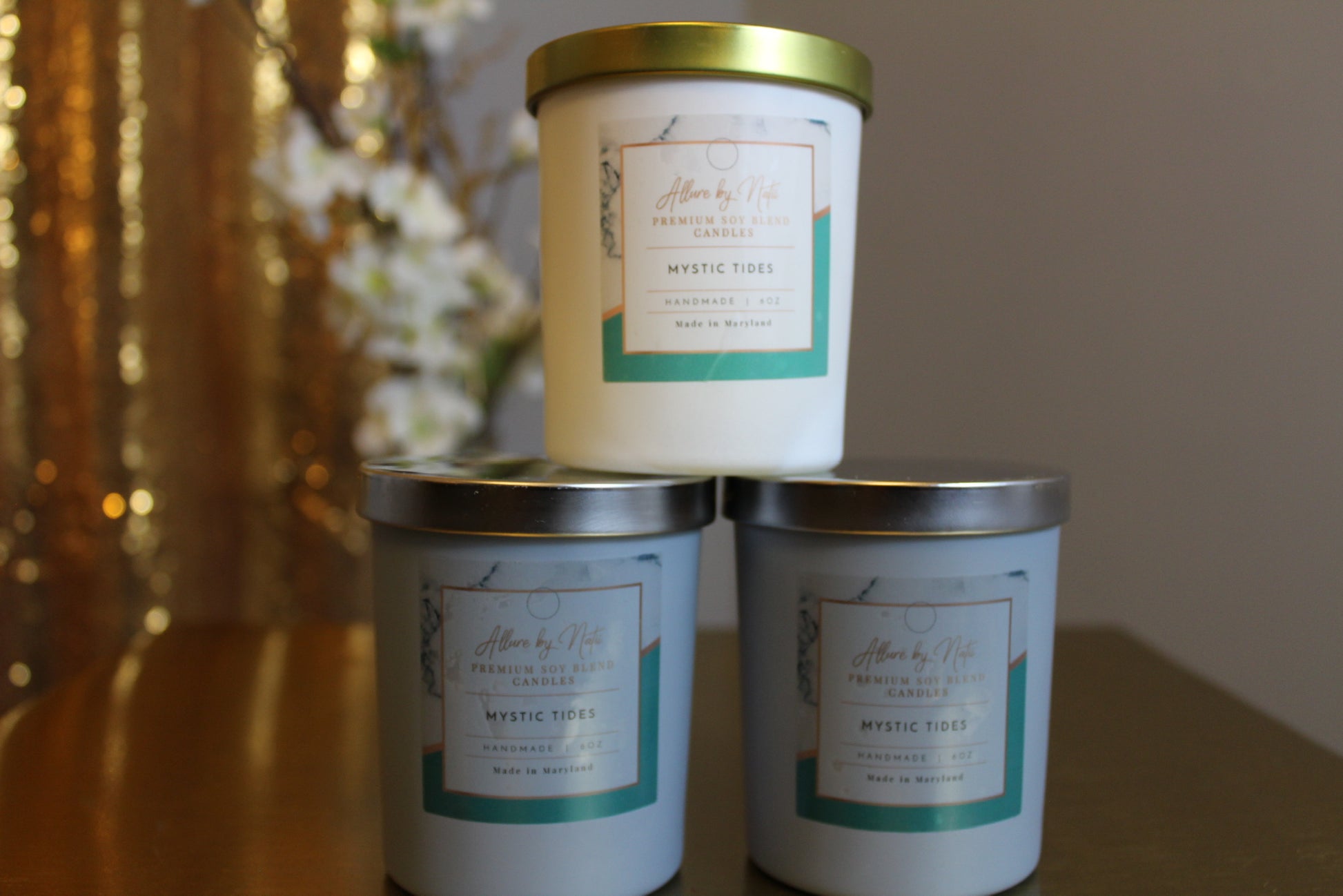 9oz Mystic Tides Premium Soy-blend Candle. Comprised of a vegan wooden wick that crackles for the ultimate relaxation.