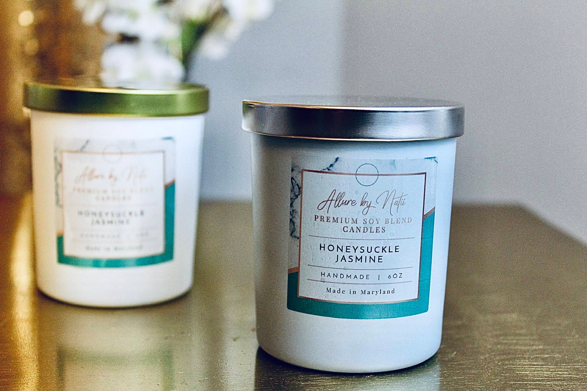 6oz Honeysuckle Jasmine Premium Soy-blend Candle. Comprised of a vegan wooden wick that crackles for the ultimate relaxation..